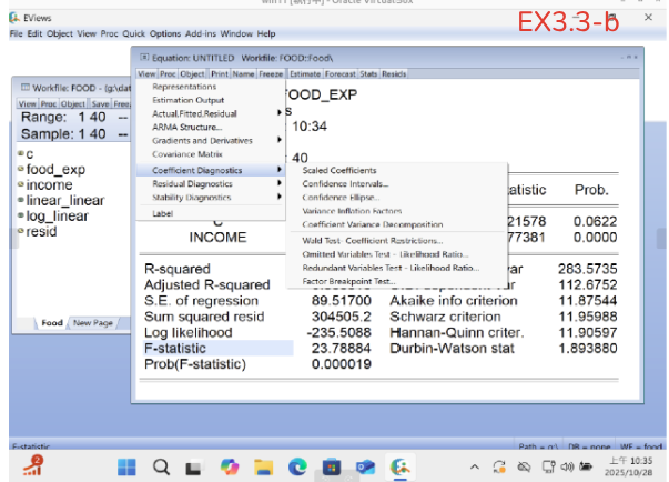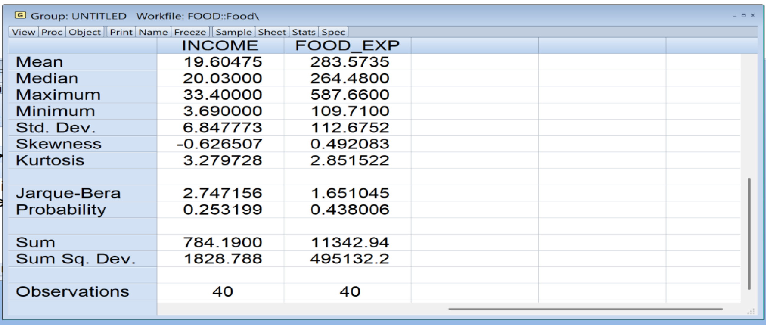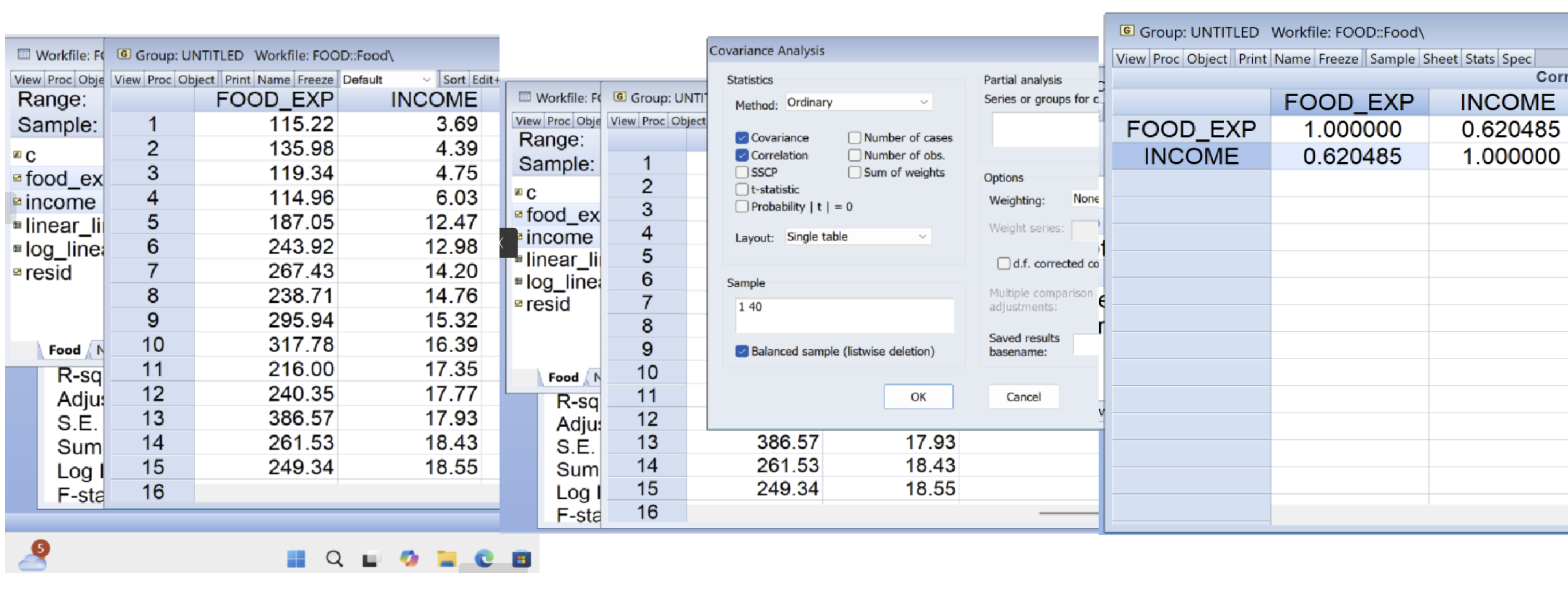 選food_exp +Ctrl incomme > Open as group > View > Covarance Analysis > Correlation打勾 >OK