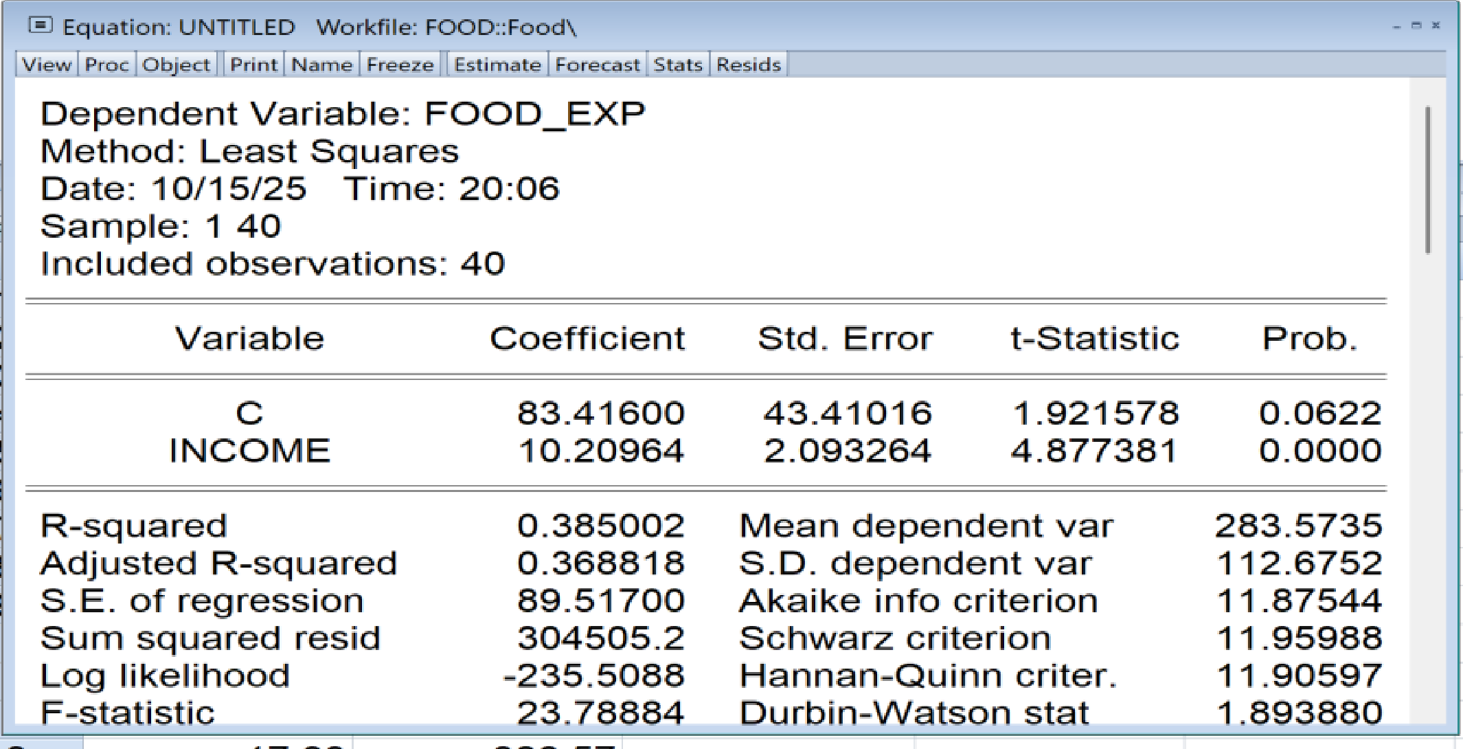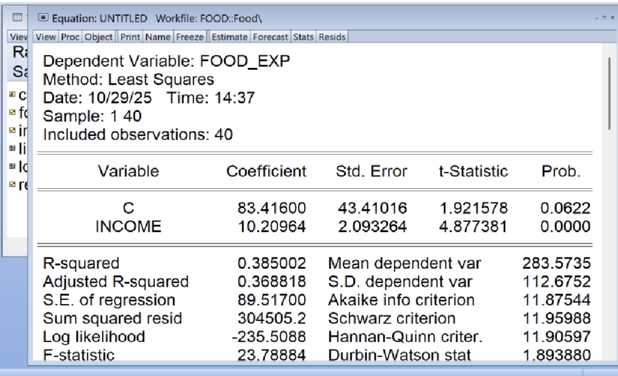 FOOD_EXP = 83.42 + 10.21 INCOME R<sup<2> = 0.385002