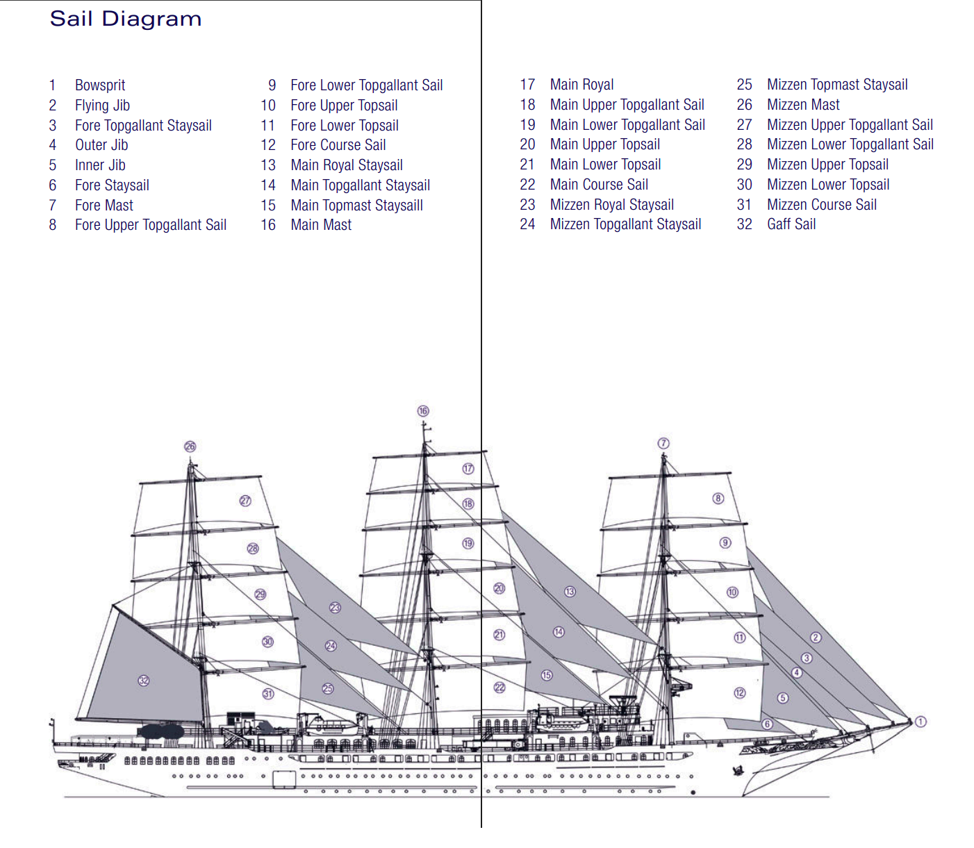 我們開著只有主帆Main Sail和前帆Jib Sail(船首三角帆)的單桅小帆船就可以到處趴趴走,但總想不明白以前的大帆船那麼多大小帆,究竟什麼作用如何操控?這次有機會搭乘Sea Cloud-Spirit可以來親眼見識、體會三桅大帆船的操作,算是美夢成真。